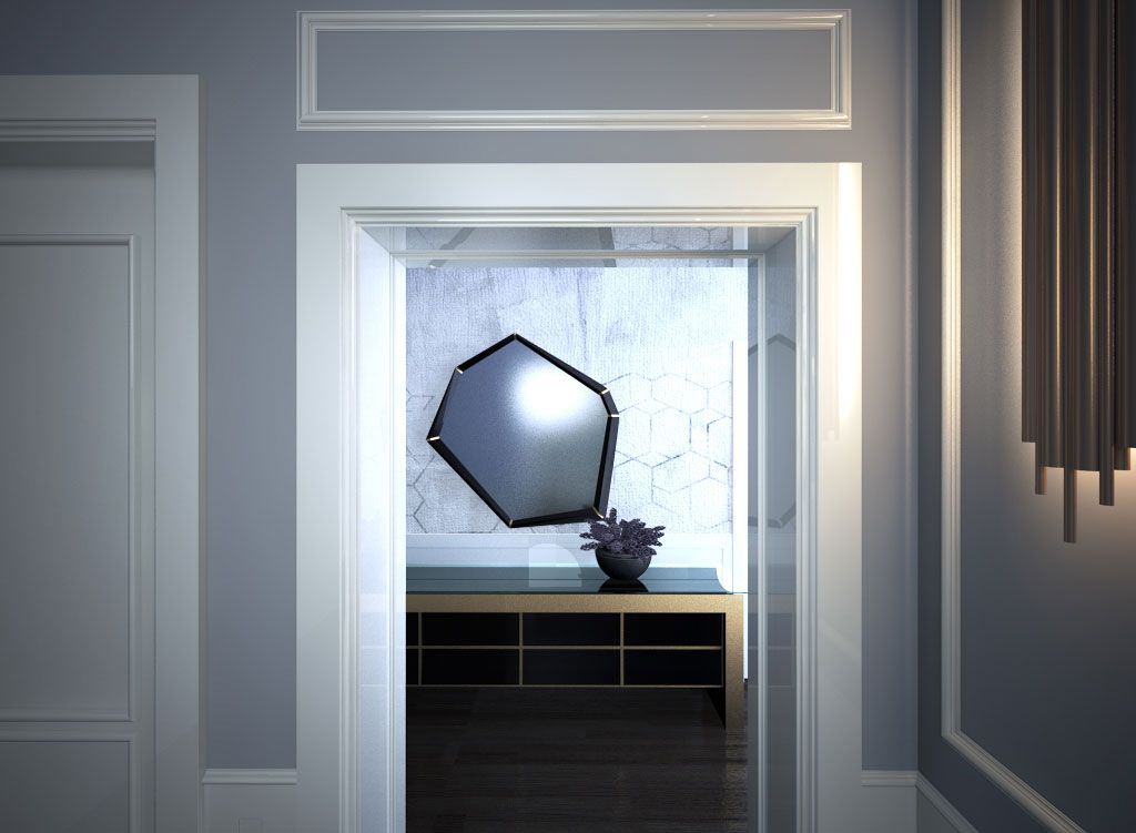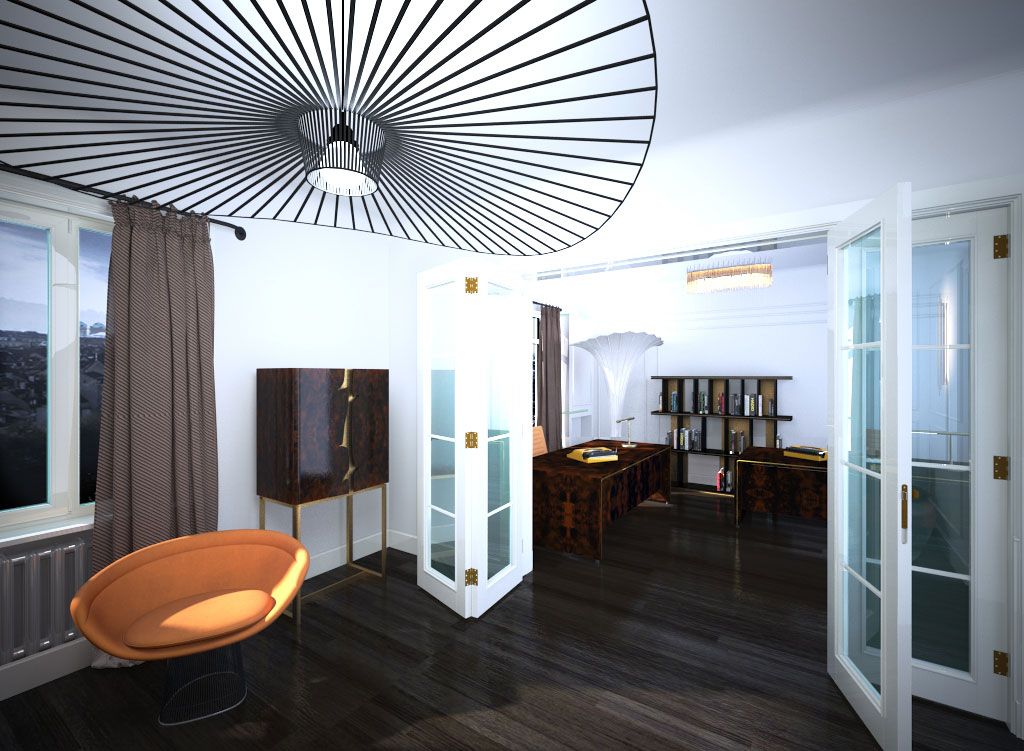 Aceasta influenta am incercat sa o redam si la interior pastrand profilatura originara, dar propunand piese de mobilier cu reflexii metalice mate, cu forme clasice reinterpretate in contras cu corpuri de iluminat: unele glam, altele cu influente ale stilului industrial.