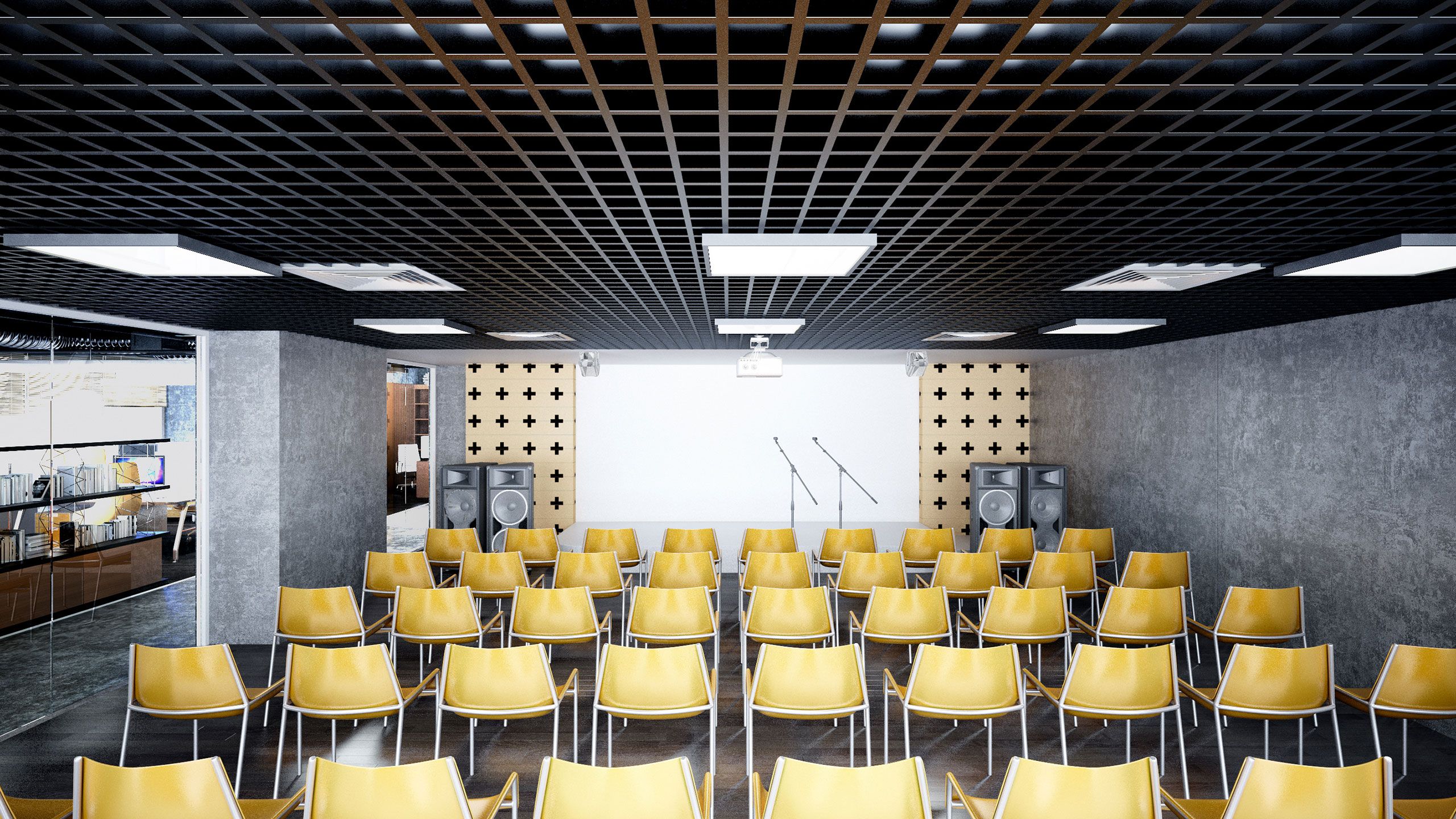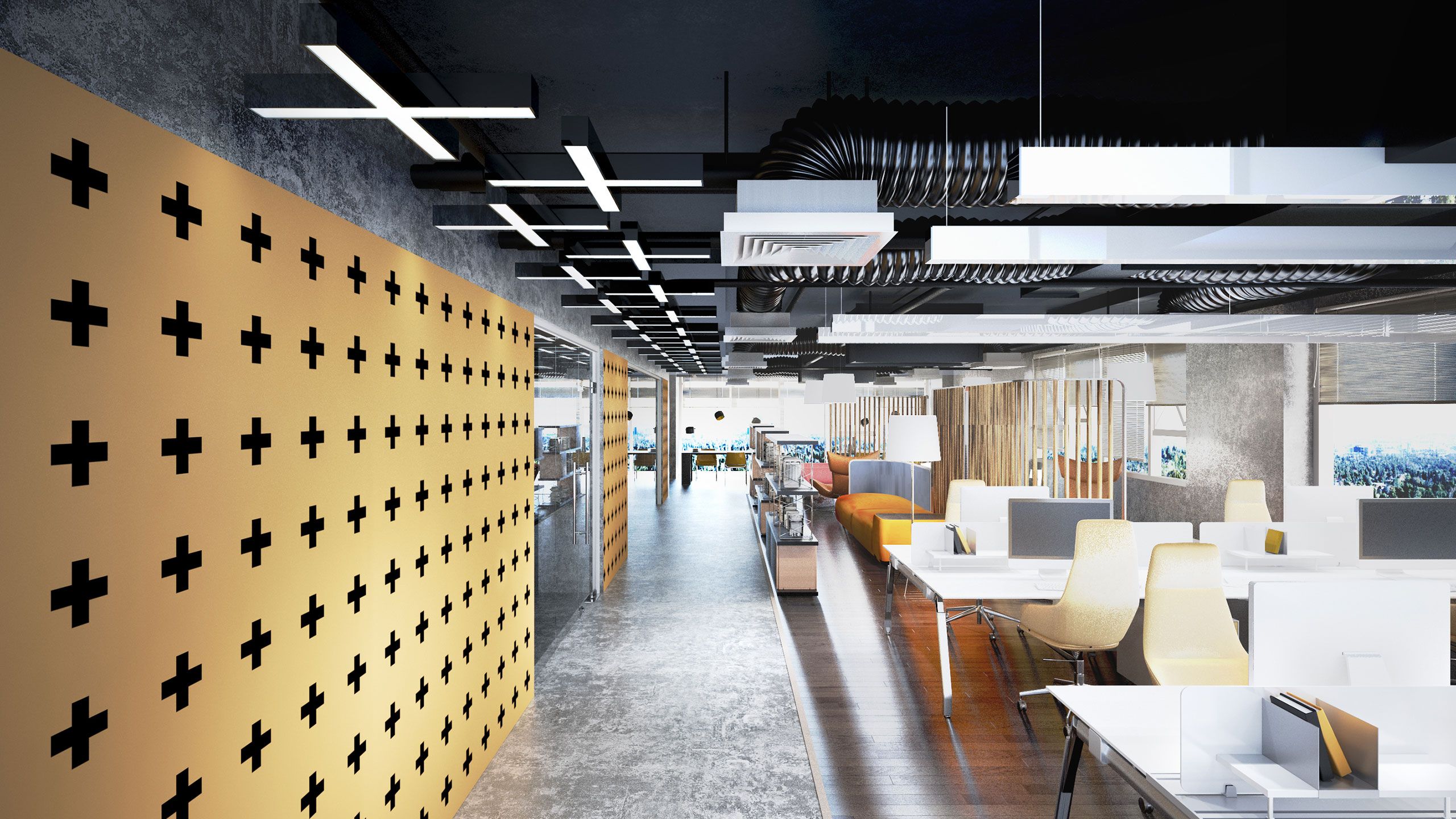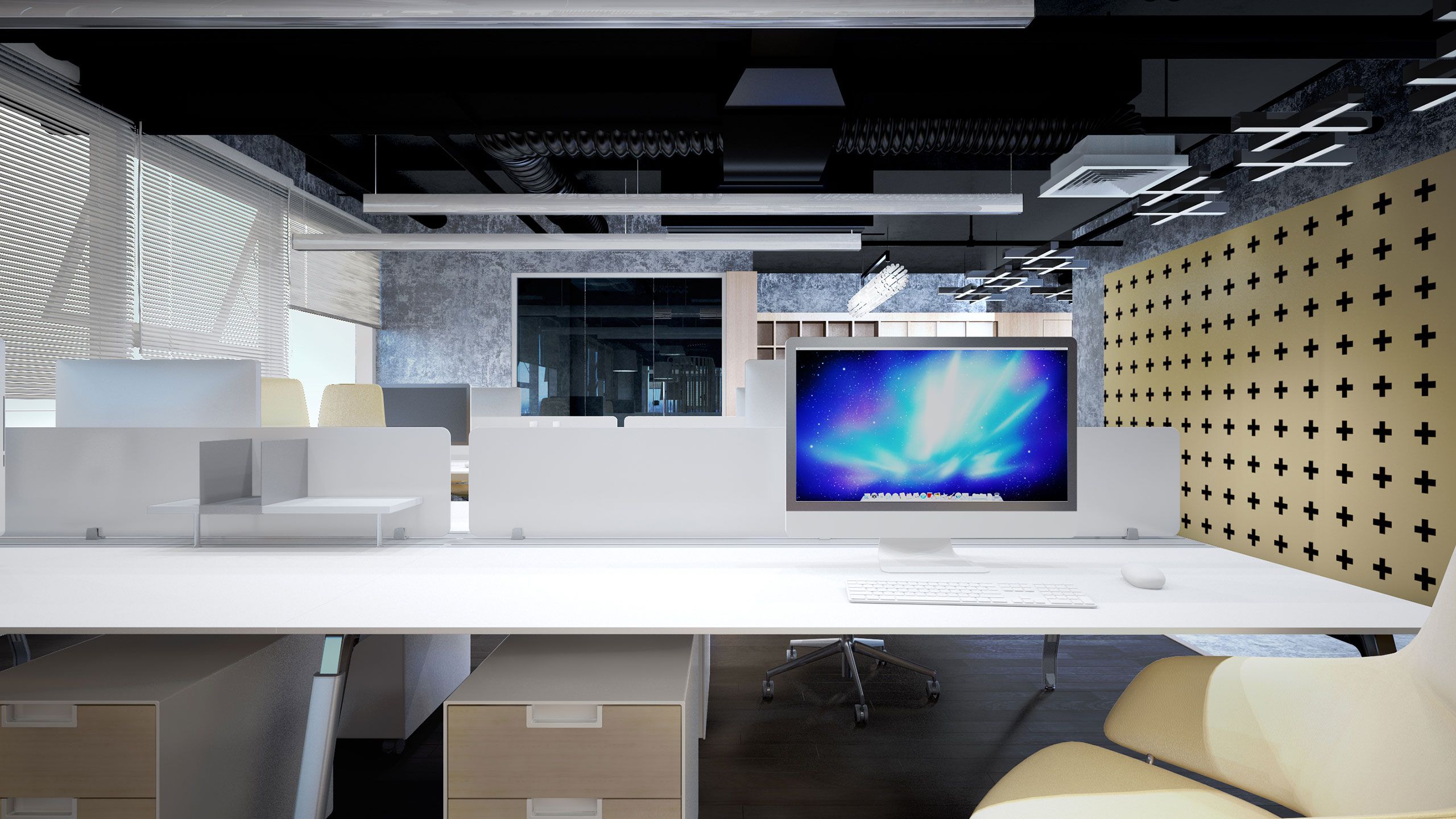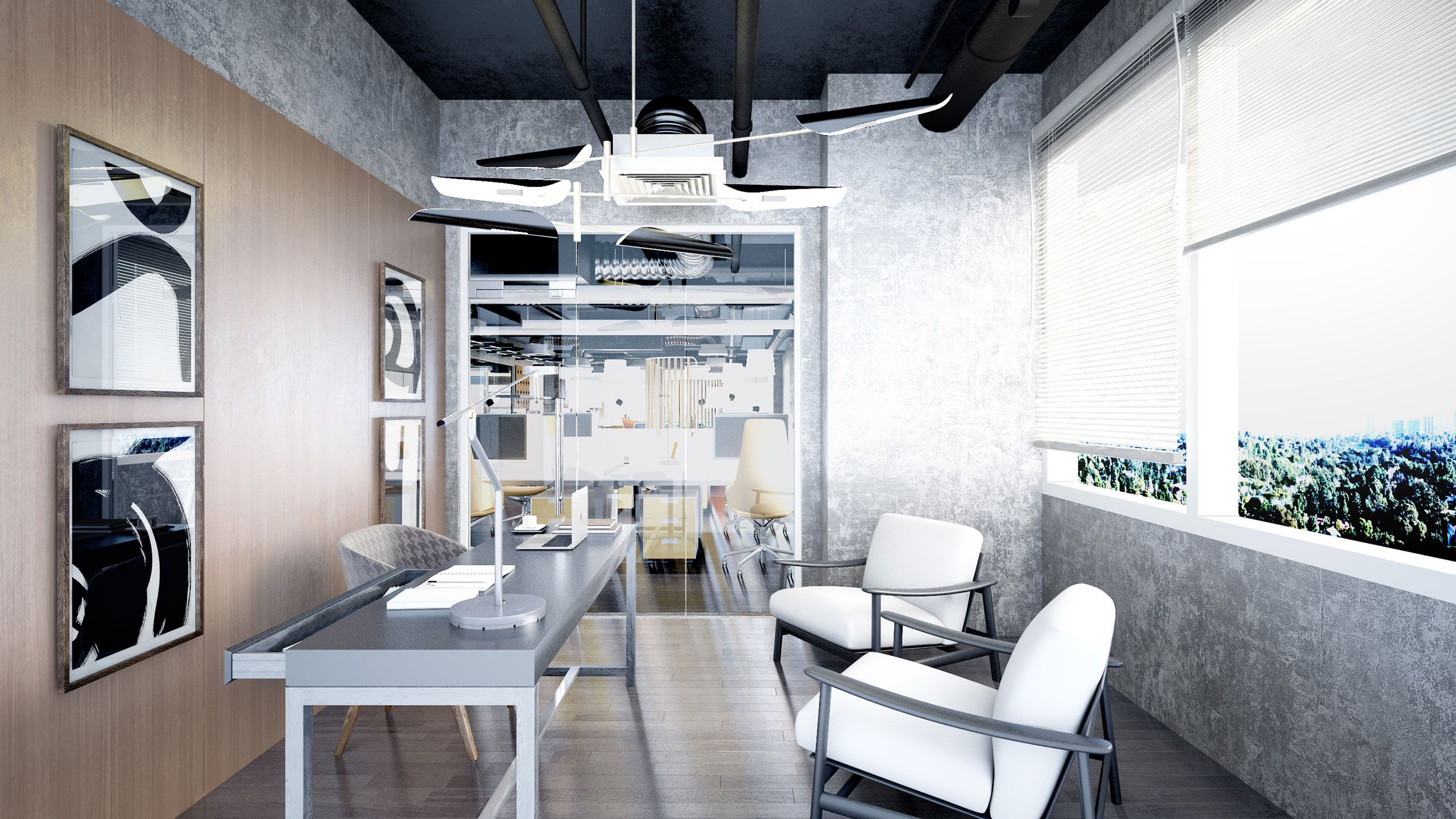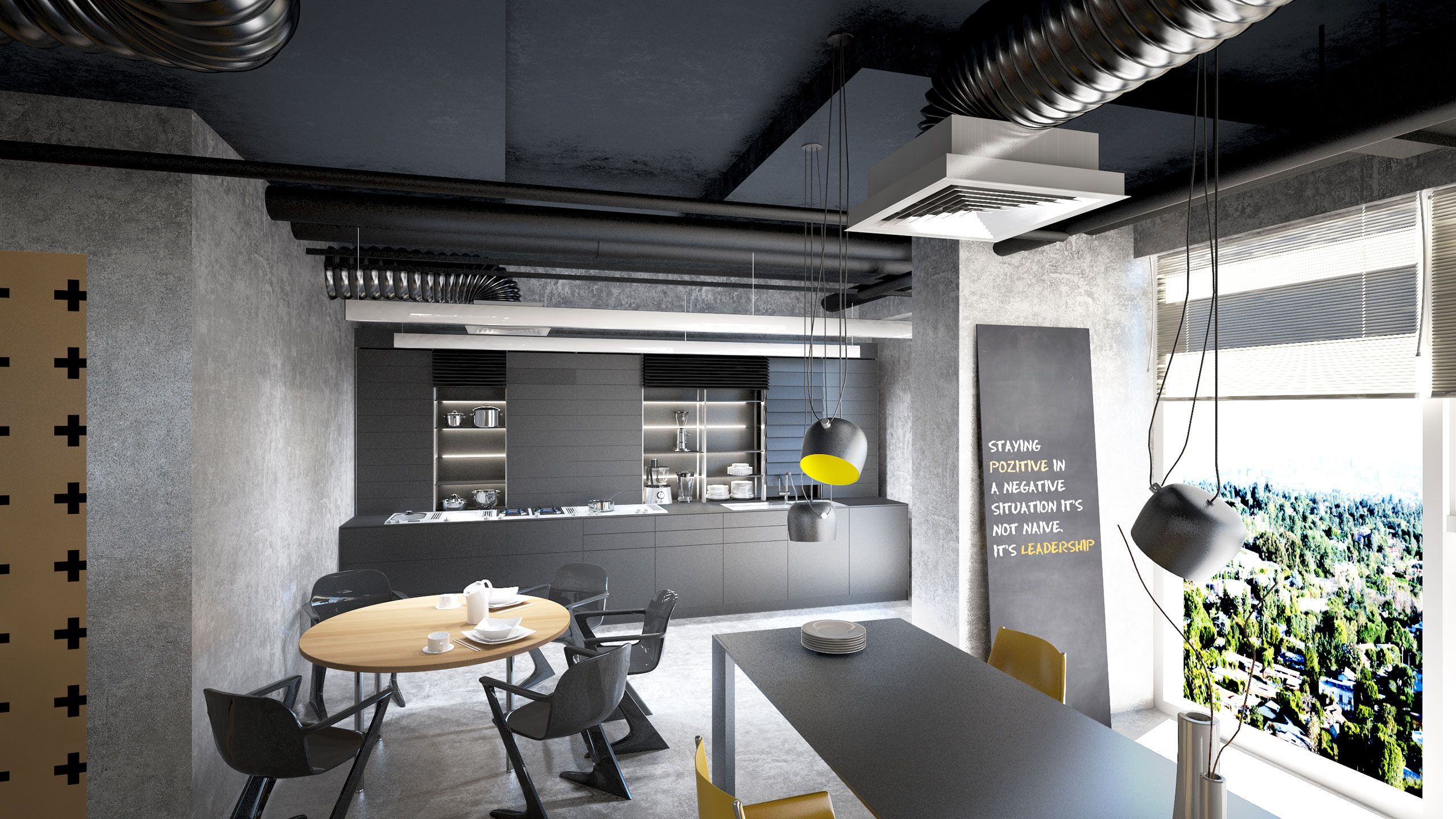 Sala de lucru este la randul ei impartita in 3 zone: zona de lucru propriu-zisa, zona de socializare sau asteptare si o zona de servit masa. Ea a fost gandita in stil industrial cu influente high-tech; delimitarea de culoarul de trecere se face printr-un mobilier stand-alone si prin sisteme de iluminat distincte.