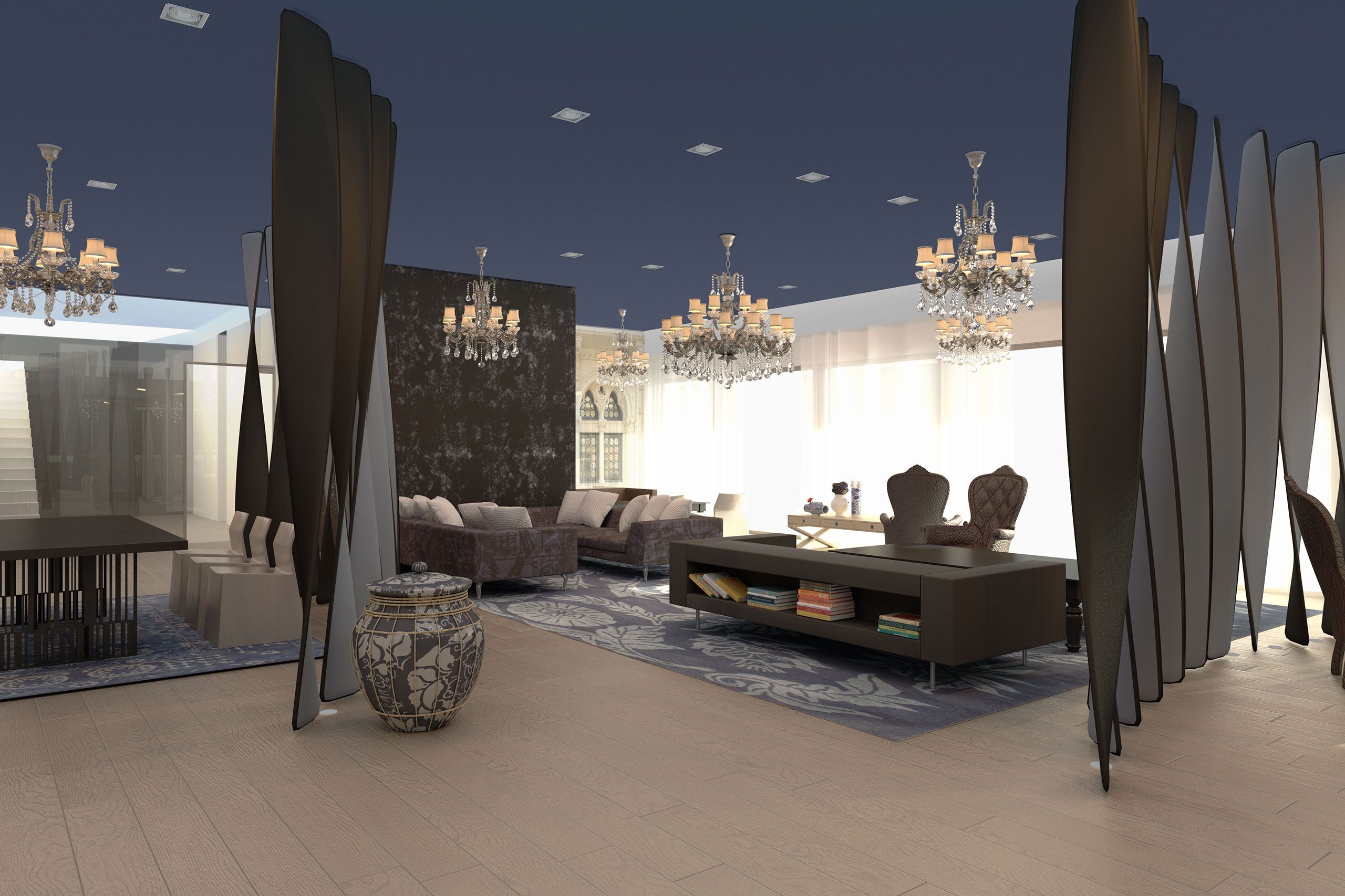 Zona socializarii este determinata de covorul albastru si a mobilierului de sezut in forme variante si cu tente de albastru-violet. Zona meselor este delimitate de lampadarele cu abajur in forma de joben.
