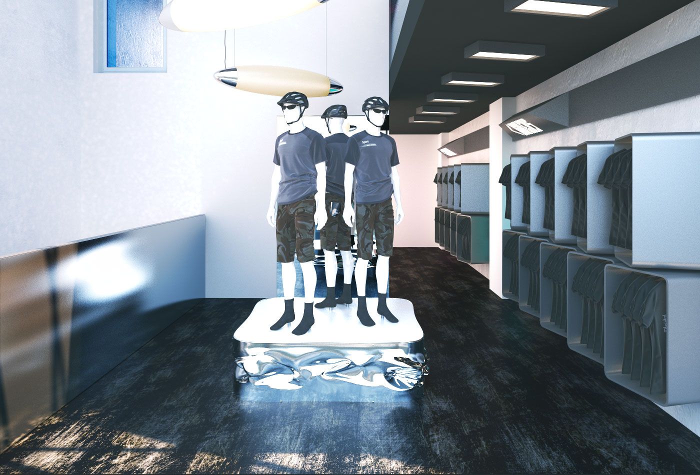 Zonele de expunere sunt formate din forme paralelipipedice inclinate orizontal la 30 de grade, randurile consecutive avand orientari opuse, astfel am putut ajunge la un ritm asemenea unui pattern al stilului Memphis. Aceste forme au fost produse din fibra de sticla cu finisaj mat cu reflexii cromate.