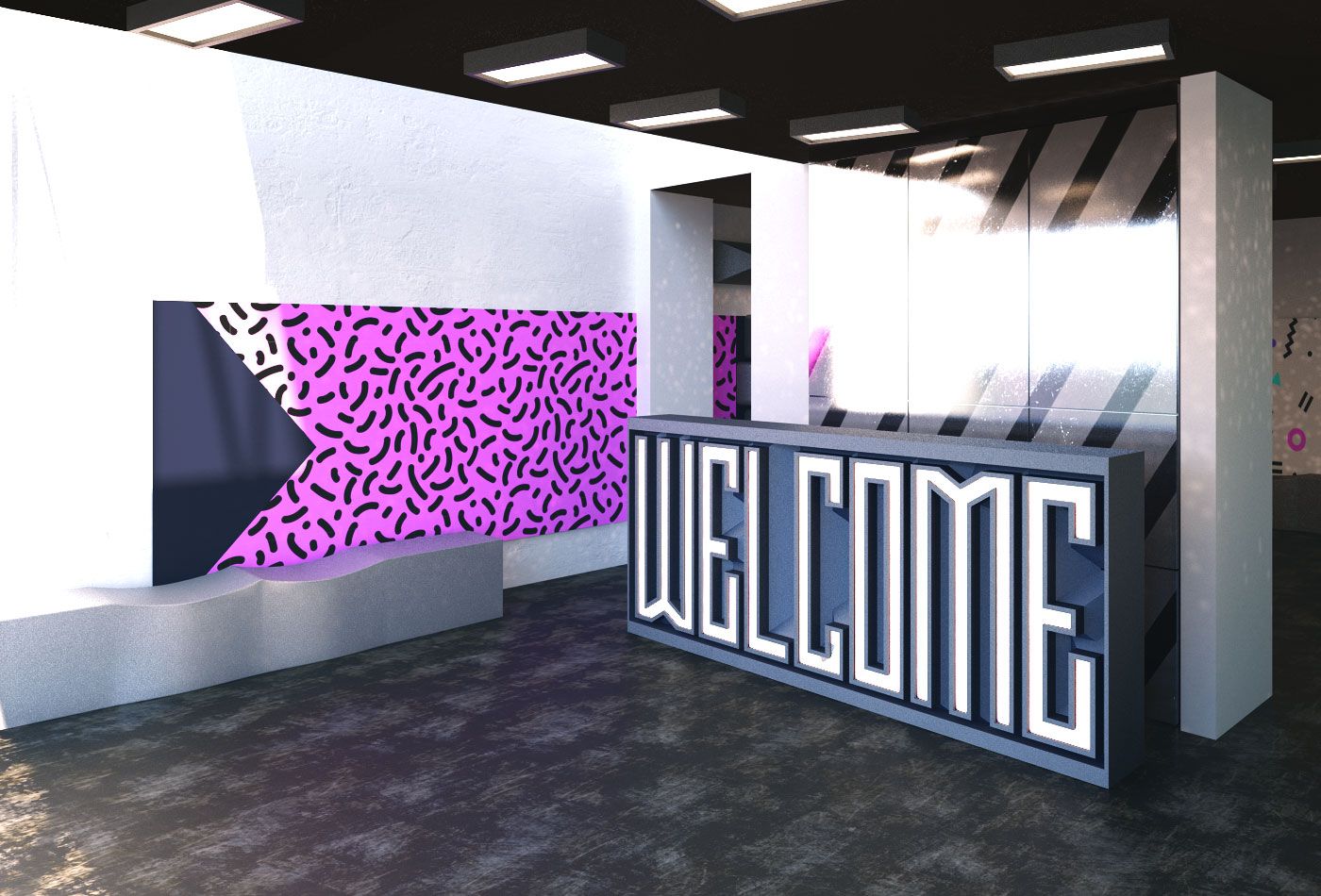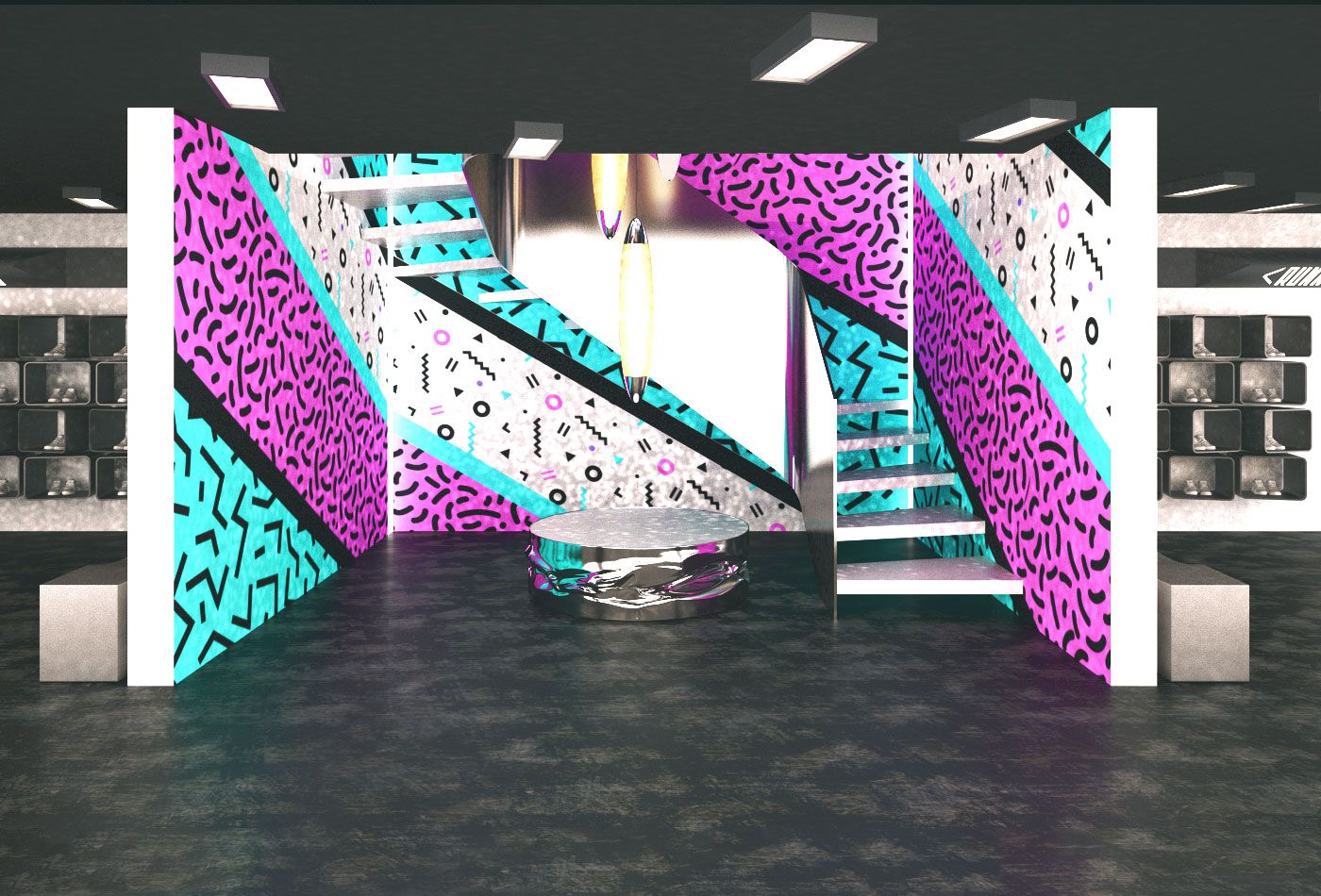 Designul spatiului este influentat de stilul Memphis, un stil abstract aparut in anii ’80 si care consta in alaturarea formelor abstracte clasice intr-un ritm si o secventa avand umbre de diverse culori, toate contribuind la un nou mod de exprimare grafica.