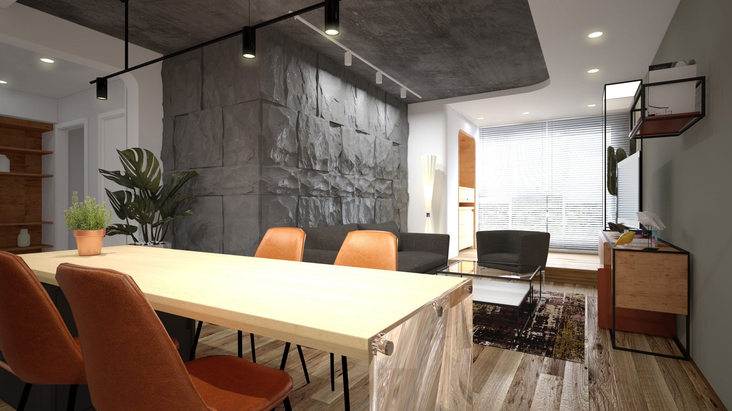 Livingul este dominat de placari verticale de beton decorativ in forma unor blocuri de granit, iar mobilierul este cu furnir de fag ce aminteste de culoarea nisipului. Pentru a da impresia de plutire, mobilierul si masuta din fata televizorului sunt puse pe un cadru metalic, pastrand partea de depozitare la o inaltime fata de nivelul de calcare.