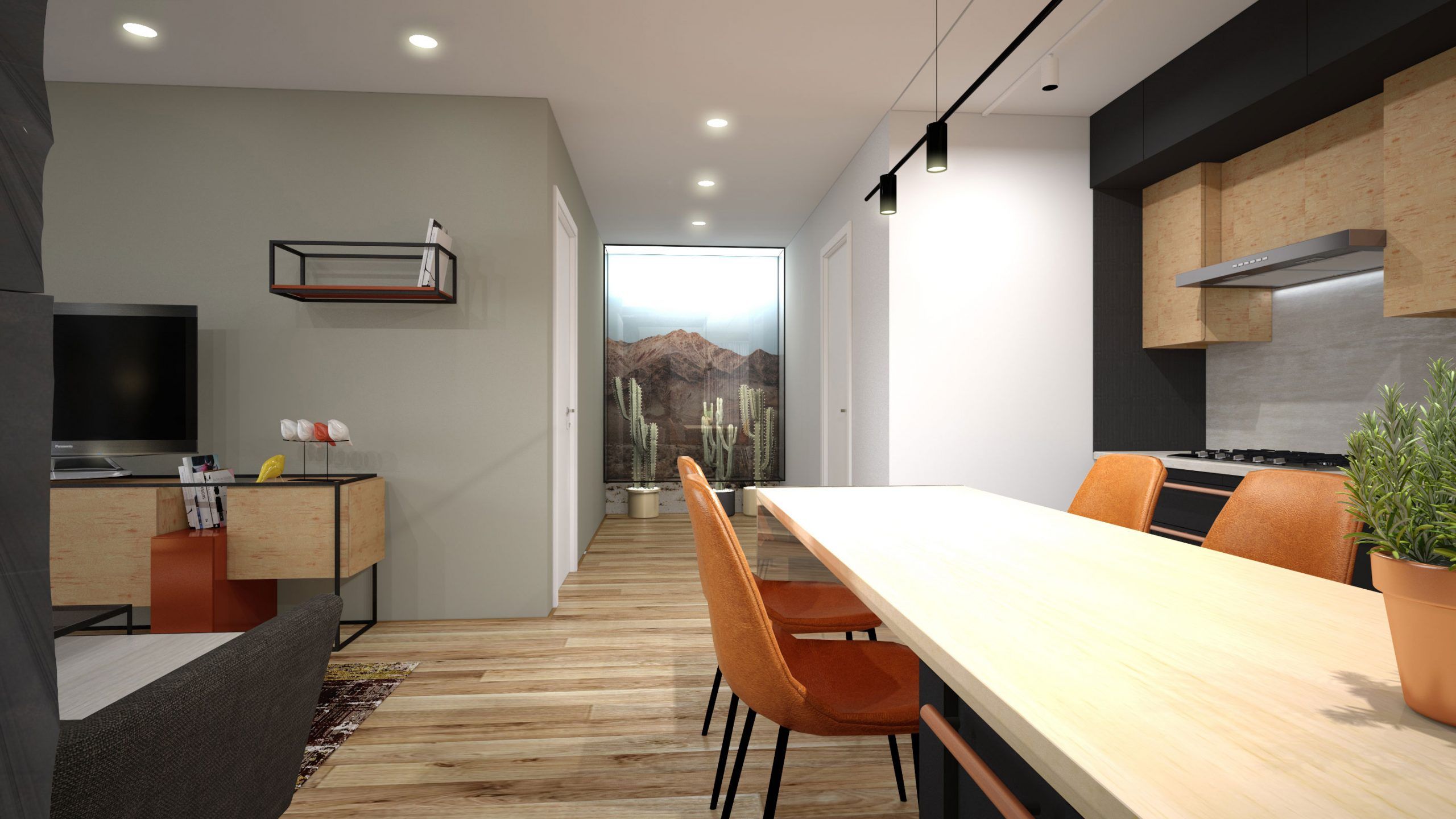 Holul de la intrare este dominat de un fototapet ce ilustreaza un desert, dublat de cactusii din fata fototapetului, ce au rolul de a prelungi imaginea astfel incat sa creeze aparenta ca ar putea fi chiar o fereastra cu vedere la desert.