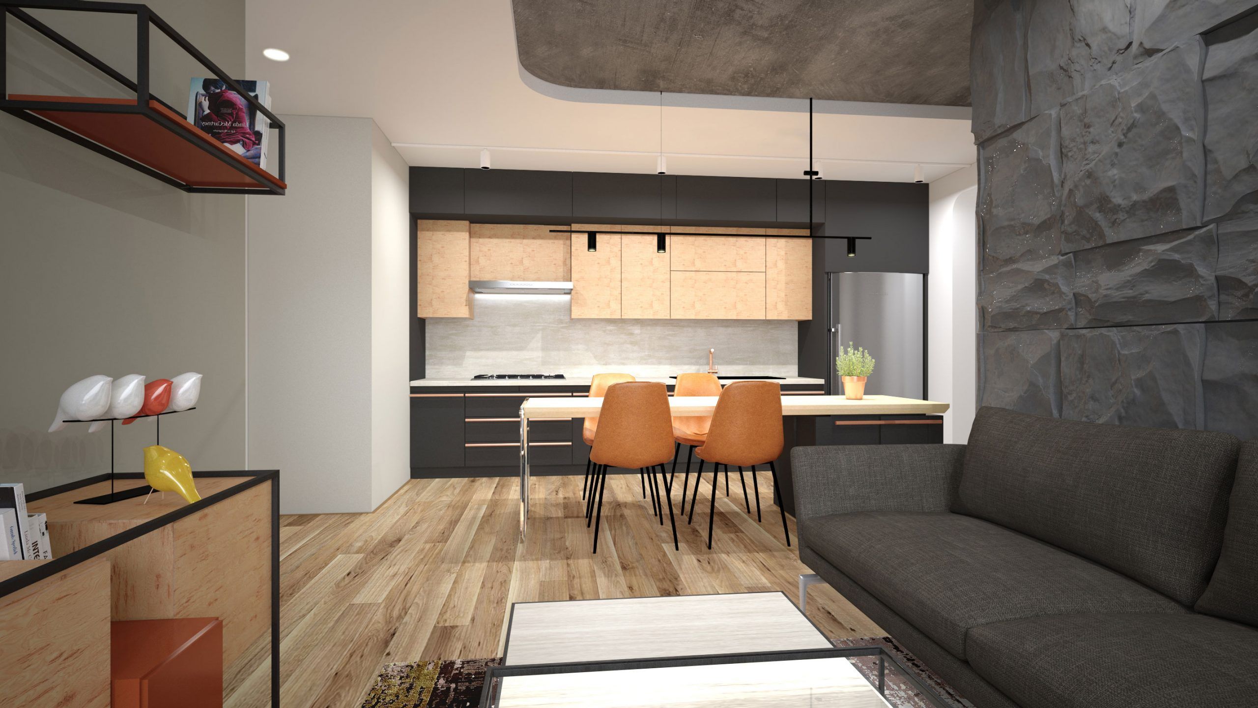 Bucataria a fost special gandita cu tonuri de gri inchis si mobilier cu furnir de fag pentru a da profunzime spatiului. Ca accent cromatic, a fost ales portocaliul ce se regaseste la scaunele din jurul insulei centrale, cat si la partea de depozitare a mobilierului pentru televizor. Efectul de levitatie al blatului este dat de sticla securizata ce joaca un rol structural in partea exterioara a insului bucatariei.