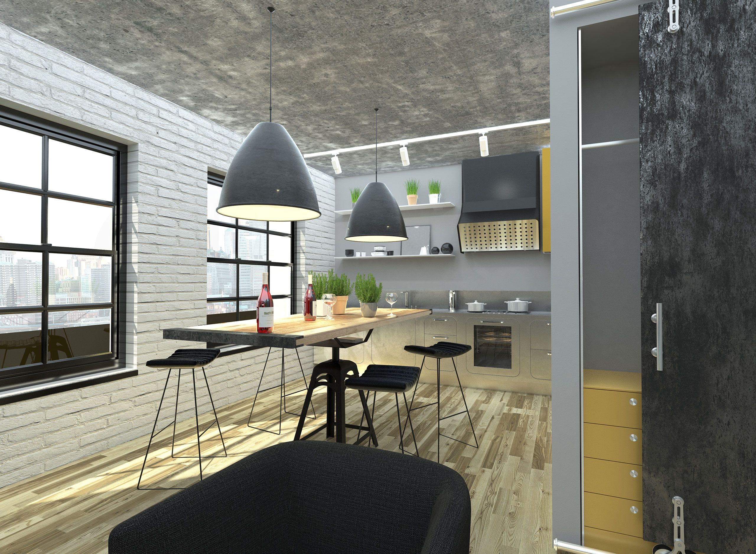 Bucataria si livingul sunt o zona open space care comunica cu holul apartamentului. Bucataria este compusa dintr-un singur front de lucru si este in mare parte metalic. El inglobeaza partea de depozitare terestra, cat si aragazul si masina de spalat vase.