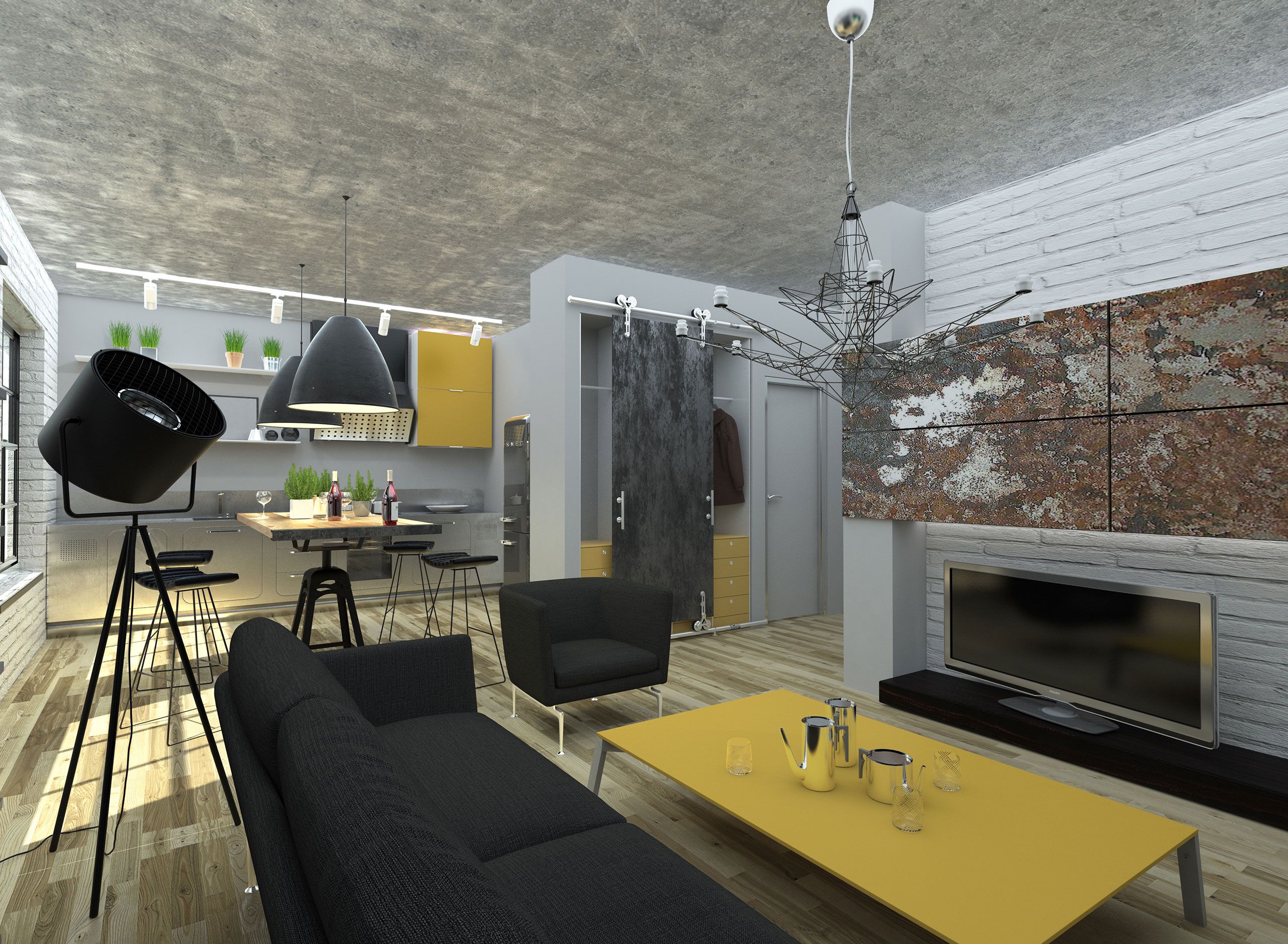 Livingul este gandit ca fiind o zona de relaxare cu o depozitare deschisa pentru carti, un spatiu de socializare central compus din canapele si o masa galbena ca accent si zona TV cu o depozitare inchisa cu placaje ce imita rugina. Pentru o mai mare eficientizare a luminarii au fost alese 2 lampadare minimaliste high-tech.