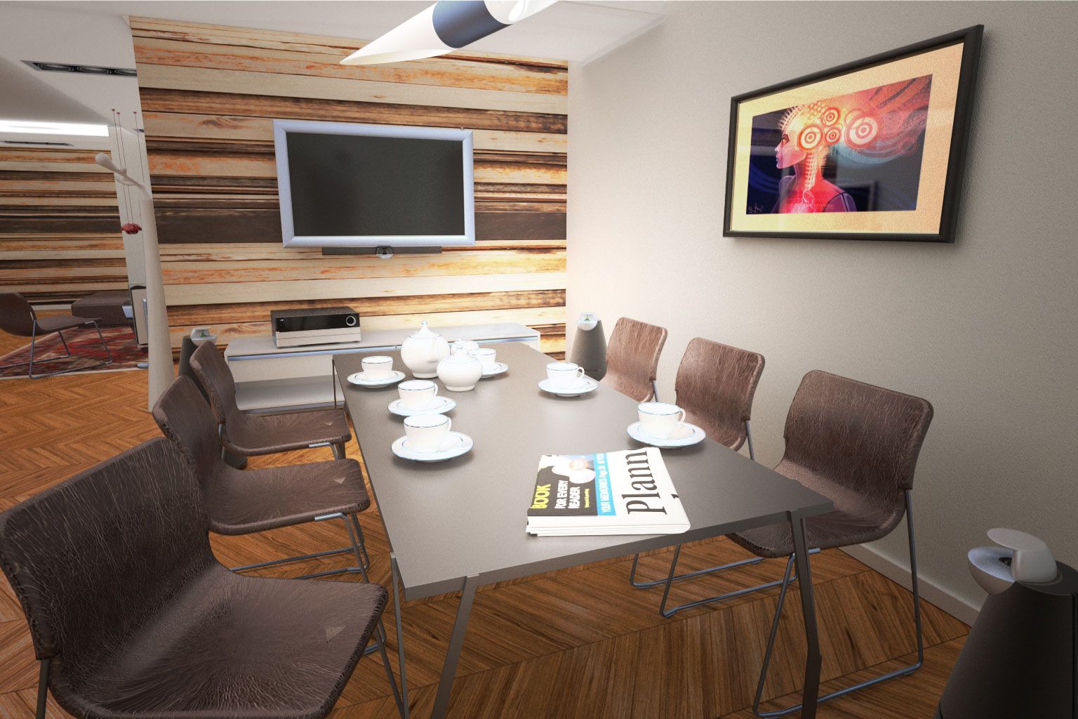 Locul de luat masa fiind in vecinatatea barului bucatariei deschise foloseste obiecte simple: o masa supla, scaune din piele, iar peretele cu televizorul fiind placat cu lemn confera spatiului un accent rustic in contrast cu spiritul minimalist in care s-a facut amenajarea da tenta de high-tech.