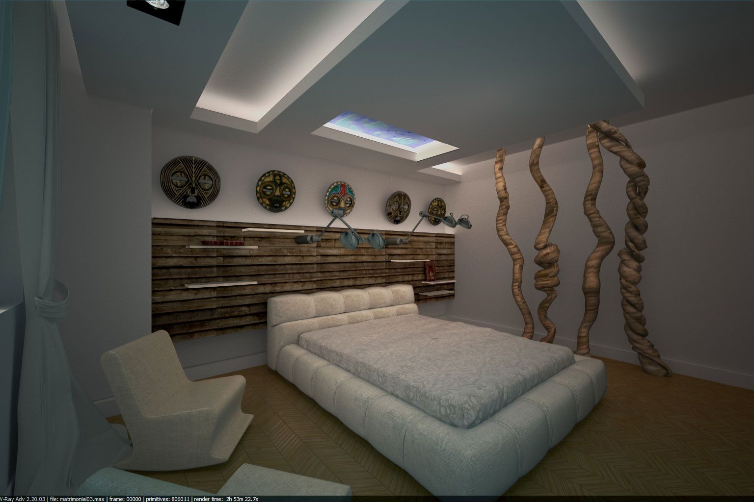 La amenajarea dormitorului, s-au folosit masti africane de lemn, coloane de franghie pretensionata si o iluminare a care sa puna in valoare lavabila decorativa, sidefata a tavanului. Aceasta din urma a fost special gandita pentru a creea senzatia de “fereastra deschisa catre cer”; culoarea albastra de baza a lavabilei, textura de stucco-marmura propusa si micile denivelari ce stralucesc dau impresia de cer instelat.