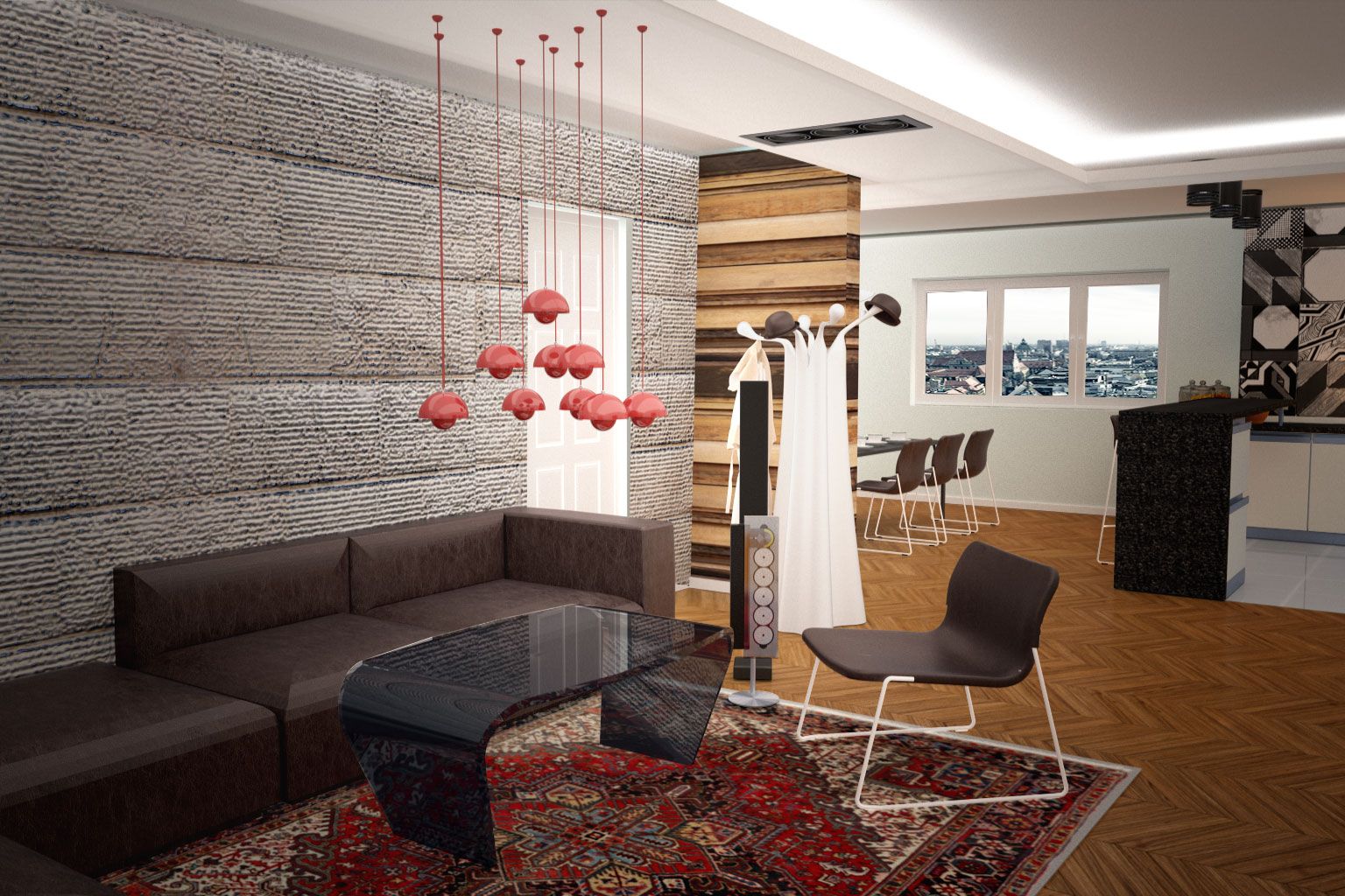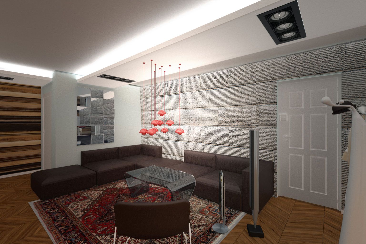 Holul si livingul respecta ideea de high-tech cu canapele si tabureti minimalisti, cu corpuri unifunctionale cum ar fi boxele audio cilindrice, cuierul din fibra de sticla si covorul ce confera o intimitate sporita zonei de sedere. Pentru a adauga un ritm au fost folosite bucati de oglinda lipite intre ele care, imbinate la unghi si cu o anumita panta, dau sentimentul de departare fiindca ajung sa reflecte colturi total diferite ale camerei.
