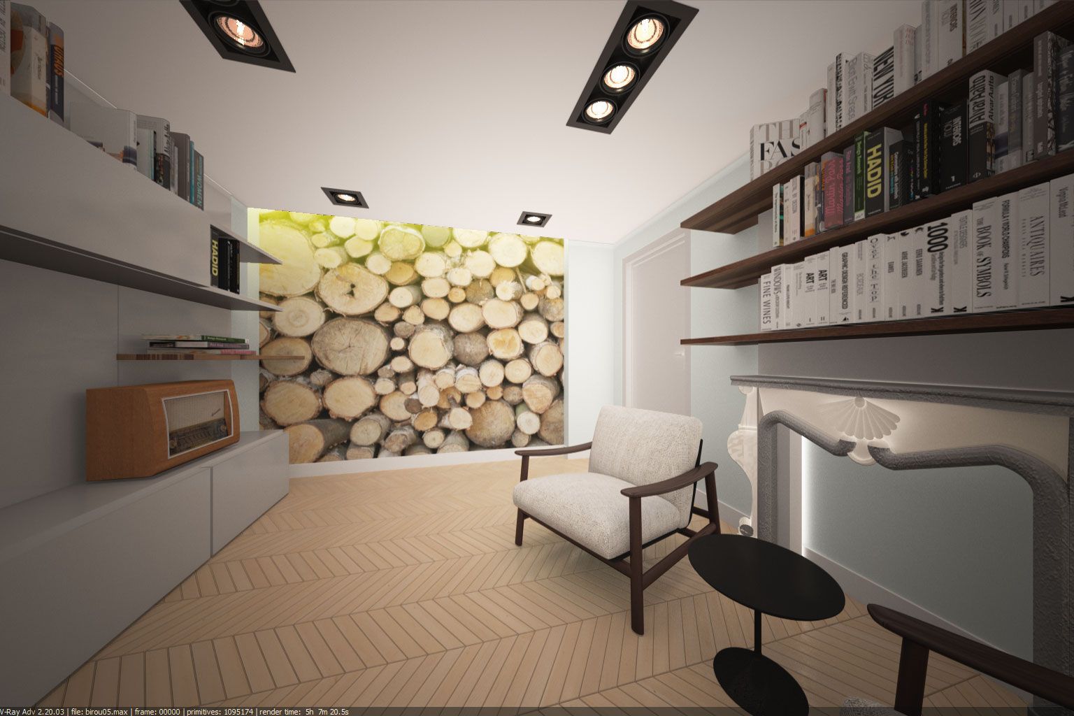 Biroul a fost gandit astfel incat, pe langa destinatia sa principala – spatiu de lucru, sa poata fi utilizat si ca spatiu de socializare, de organizare de mici intalniri. Simplu si frumos, mobilierul specific e alcatuit din birou si fotoliu confortabil, corpuri de biblioteca si zona destinata invitatilor. Tonul unitar e dat de paleta cromatica si materialele folosite, de fototapetul cu imagine de busteni care induce sentimentul de ancorare in realitate, dar si iluminatul perimetral, punctiform si echilibrat care a fost propus.