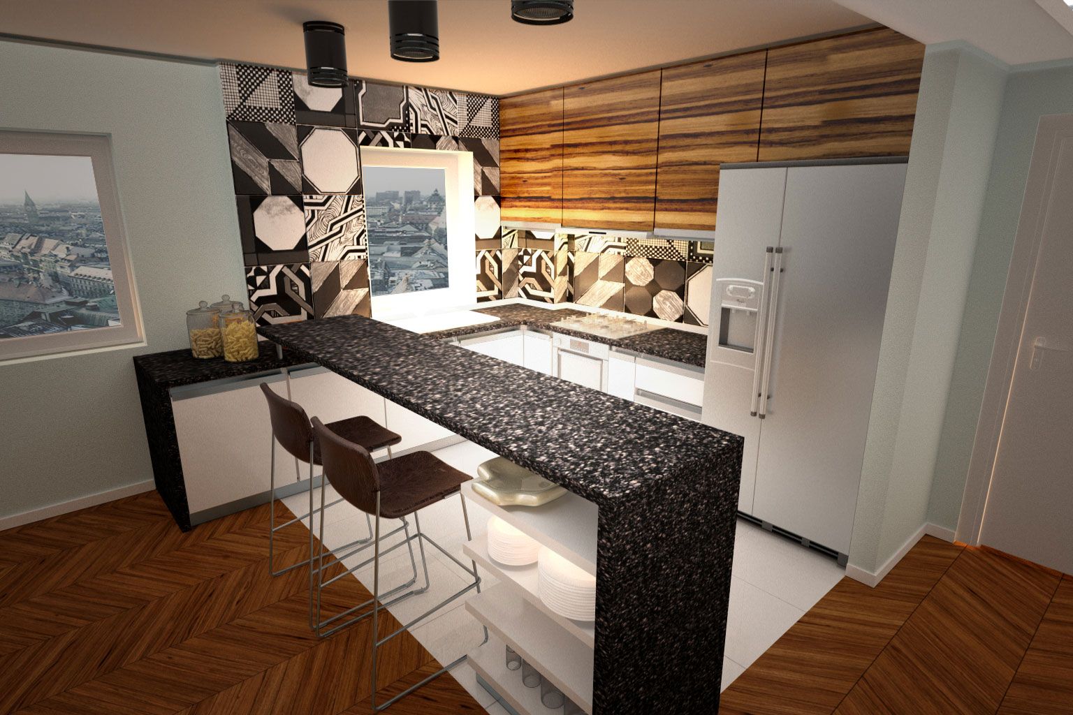 La bucatarie, am mizat pe o deschidere mare catre zona de servit masa, spre hol si zona livingului. Am propus o mobilare din MDF cu un desen clar de lemn si un blat de lucru care sa creeze o demarcare clara intre lemn si faianta cu desen abstract. Faianta prelungita pe amandoi peretii delimiteaza spatial de gatit fata de restul incaperii. Astfel se creaza o compozitie de forme ale literei “L”.