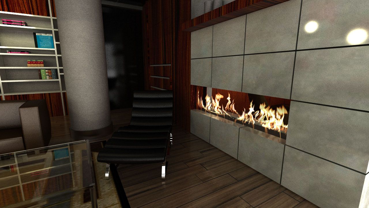The living room and the office are minimal; I have used plywood interior made of Eternit to delineate the office from the living room and to make a point of interest around the fireplace with bio-ethanol and adjacent storage spaces.