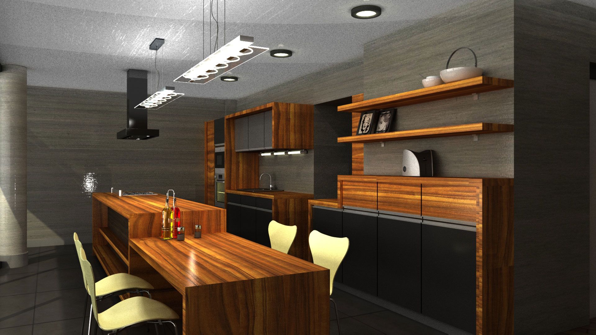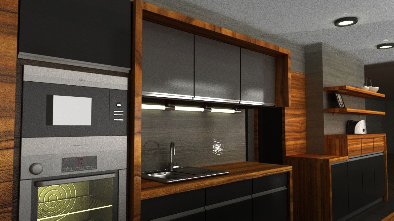 The three bodies have three registers of different height. I tried to compliance horizontal lines and the rhythm of the countertop that lines the bodies on the wall with the entrance in the kitchen. Through the use of the two materials, wood and dark gray mat material, we have created a high rhythm, passage of which is nuanced by longitudinal profile handles.